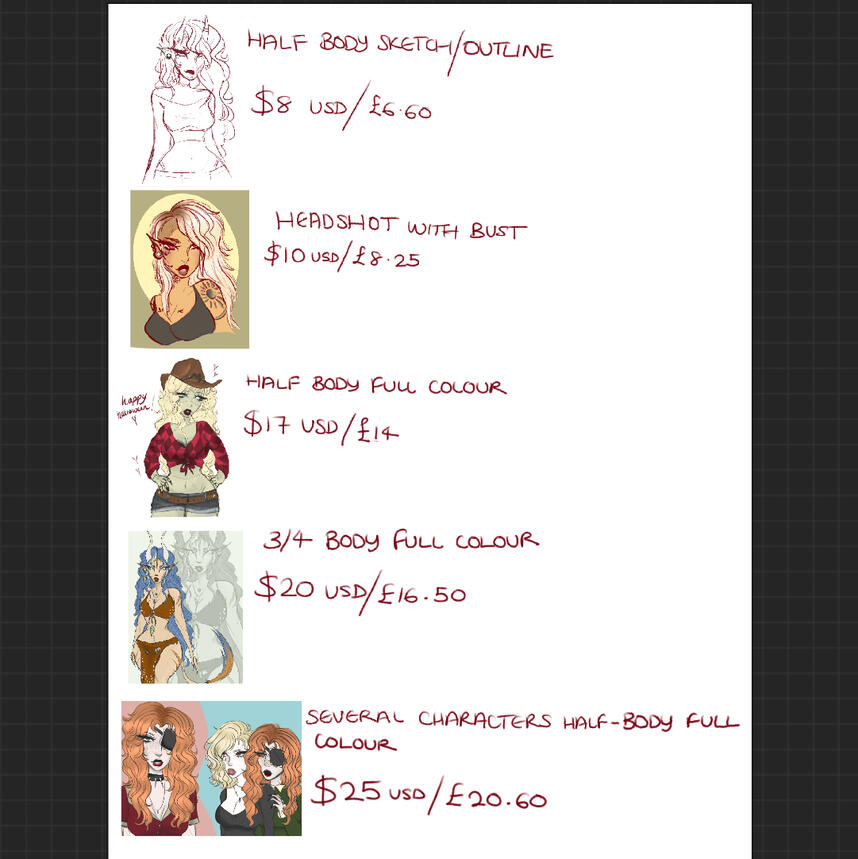 1: requesting a commission - I accept requests via discord or instagram message, preferably discord, as it is easier for me to access. we will discuss what it is that you want, and pricing. I do not negotiate on my prices. again, please make sure to either check my art station, or ask to see some of my work!2: payment - once a commission has been requested, I will need 50% of the total price to be paid before I begin. the payment will have been discussed beforehand. I accept payments over PAYPAL, and via online banking.3: the finished piece - I am able to send progression pictures throughout the time the commision is being completed, but they will be heavily watermarked. Once the piece is finished, I will expect the other 50% of the cost upon me sending it. if there is anything that needs to be altered i am open to doing that.